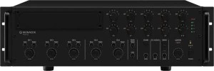 10-strefowy wzmacniacz miksujący PA, mono · 1 x 600WRMS · 10 stref, sterowanych osobno · 3 wejścia mikr./linia, gniazda Combo · 2 wejścia liniowe stereo, gniazda RCA · Dodatkowy wzmacniacz o mocy 60 W do emisji osobnych komunikatów za pomocą strefowego mikrofonu przywoławczego PA-2400RC, jeżeli wybrano nie więcej niż 2 strefy · Gong 2 lub 4-tonowy, dźwięk wyjący i ciągły, automatyczne wyciszanie · 2-punktowy korektor barwy, regulator głośności, diodowy wskaźnik poziomu sygnału/szczytu · Sterowany temperaturowo wentylator · Możliwość zamontowania różnych modułów audio · Zasilanie phantom 15V dla mikrofonów elektretowych · Możliwość podłączenia max 32 mikrofonów strefowych PA-2400RC · Możliwość podłączenia max 3 mikrofonów push-to-talk PA-4300PTT · Automatyczne komunikaty alarmowe z modułu PA-1120DMT (dostępny jako wyposaż. dodatk.) · Zasilanie sieciowe lub awaryjne 24V · Zdejmowany uchwyty montażowe Moc szczytowa (peak) 600 W Moc znamionowa RMS 600 W Moc znamionowa RMS przy 4Ω 600 W Moc znamionowa RMS przy 100V 600 W Kanały wejściowe 5 Strefy 10 Wejścia 2.5 mV/5 kΩ, 0.3 V/5 kΩ (mic/line 1-3), 0.3 V/15 kΩ (line 4-5), 0.775 V/100 kΩ (przedwzmacniacz) Pasmo przenoszenia 55-16 000 Hz Korektor niskie ±10 dB/100 Hz Korektor wysokie ±10 dB/10 kHz Stosunek S/N > 70 dB (mic), > 80 dB (line) THD