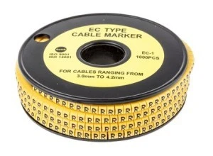 Znaczniki kablowe RS EC-1. Te elementy ślizgowe na żółtym znaczniku na przewodzie PVC są wykonane z najcieńszego miękkiego, Durable PCW, odpornego na erozję oleju, smaru i innych materiałów. Znaczniki kablowe typu EC-1 posiadają wysokiej jakości elastyczne wnętrze, dzięki czemu można je dopasować do długości od 2,0 do 3,20 mm. Te slajdy na znacznikach kabla PVC mają pogrubioną czarną barwę na żółtej części ciała. Wykonane z najdrobniejszego PVC Odporne na działanie oleju i smaru Temperatura maksymalna 85°C. Dostarczane w postaci rolki