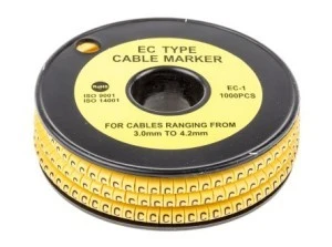 Znaczniki kablowe RS EC-1. Te elementy ślizgowe na żółtym znaczniku na przewodzie PVC są wykonane z najcieńszego miękkiego, Durable PCW, odpornego na erozję oleju, smaru i innych materiałów. Znaczniki kablowe typu EC-1 posiadają wysokiej jakości elastyczne wnętrze, dzięki czemu można je dopasować do długości od 2,0 do 3,20 mm. Te slajdy na znacznikach kabla PVC mają pogrubioną czarną barwę na żółtej części ciała. Wykonane z najdrobniejszego PVC Odporne na działanie oleju i smaru Temperatura maksymalna 85°C. Dostarczane w postaci rolki