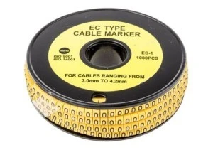 Znaczniki kablowe RS EC-1. Te elementy ślizgowe na żółtym znaczniku na przewodzie PVC są wykonane z najcieńszego miękkiego, Durable PCW, odpornego na erozję oleju, smaru i innych materiałów. Znaczniki kablowe typu EC-1 posiadają wysokiej jakości elastyczne wnętrze, dzięki czemu można je dopasować do długości od 2,0 do 3,20 mm. Te slajdy na znacznikach kabla PVC mają pogrubioną czarną barwę na żółtej części ciała. Wykonane z najdrobniejszego PVC Odporne na działanie oleju i smaru Temperatura maksymalna 85°C. Dostarczane w postaci rolki