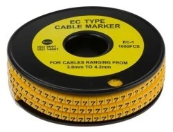 Znaczniki kablowe RS EC-1. Te elementy ślizgowe na żółtym znaczniku na przewodzie PVC są wykonane z najcieńszego miękkiego, Durable PCW, odpornego na erozję oleju, smaru i innych materiałów. Znaczniki kablowe typu EC-1 posiadają wysokiej jakości elastyczne wnętrze, dzięki czemu można je dopasować do długości od 2,0 do 3,20 mm. Te slajdy na znacznikach kabla PVC mają pogrubioną czarną barwę na żółtej części ciała. Wykonane z najdrobniejszego PVC Odporne na działanie oleju i smaru Temperatura maksymalna 85°C. Dostarczane w postaci rolki