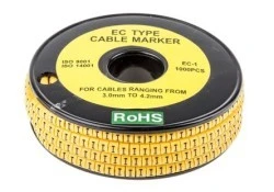 Znaczniki kablowe RS EC-1. Te elementy ślizgowe na żółtym znaczniku na przewodzie PVC są wykonane z najcieńszego miękkiego, Durable PCW, odpornego na erozję oleju, smaru i innych materiałów. Znaczniki kablowe typu EC-1 posiadają wysokiej jakości elastyczne wnętrze, dzięki czemu można je dopasować do długości od 2,0 do 3,20 mm. Te slajdy na znacznikach kabla PVC mają pogrubioną czarną barwę na żółtej części ciała. Wykonane z najdrobniejszego PVC Odporne na działanie oleju i smaru Temperatura maksymalna 85°C. Dostarczane w postaci rolki