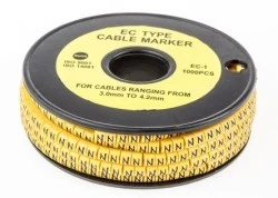 Znaczniki kablowe RS EC-1. Te elementy ślizgowe na żółtym znaczniku na przewodzie PVC są wykonane z najcieńszego miękkiego, Durable PCW, odpornego na erozję oleju, smaru i innych materiałów. Znaczniki kablowe typu EC-1 posiadają wysokiej jakości elastyczne wnętrze, dzięki czemu można je dopasować do długości od 2,0 do 3,20 mm. Te slajdy na znacznikach kabla PVC mają pogrubioną czarną barwę na żółtej części ciała. Wykonane z najdrobniejszego PVC Odporne na działanie oleju i smaru Temperatura maksymalna 85°C. Dostarczane w postaci rolki