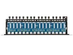 Patch panel składa się z czterech modułów PTU-54-ECO/PoE, zamontowanych w obudowie standardu RACK 19". Seria 5xx to nowo zaprojektowane moduły, posiadające lepsze parametry transmisyjne i obciążeniowe względem wcześniejszych serii, co zapewnia stabilniejszą pracę, mniejsze przesłuchy sygnału oraz pozwala zasilać urządzenia dużej mocy za pomocą standardu PoE.