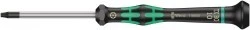Wysokiej jakości wkrętak Kraftform Micro do prac w mechanice precyzyjnej. Do wkrętów TORX® z systemem zabezpieczającym: gniazdo wkrętów TORX® BO posiada trzpień zabezpieczający, który zapobiega odkręceniu wkrętu przez osoby nieuprawnione standardowymi narzędziami do wkrętów TORX®. Tylko specjalne narzędzia TORX® BO posiadają otwór, w którym chowa się trzpień zabezpieczający. Możliwość wsparcia dłoni na obrotowym kołpaku oraz strefa pokręcania znajdująca się bezpośrednio poniżej kołpaka umożliwiają szybkie obracanie wkrętaka palcami. Eliminuje to całkowicie czasochłonne pokręcanie. Strefa przenoszenia siły, zaopatrzona w miękkie wkładki gumowe, umożliwia przenoszenie wysokich momentów obrotowych. Strefa precyzji zapewnia kontrolę kąta obrotu narzędzia podczas prac precyzyjnych. Końcówka Black Point gwarantuje dokładne dopasowanie do gniazda wkrętu oraz zwiększoną odporność na korozję. System wyszukiwania narzędzi Take it easy z oznaczeniem kolorystycznym rozmiarów ułatwia i przyspiesza odnajdywanie właściwego narzędzia.