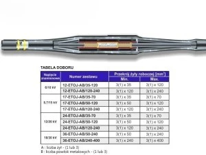 Zastosowanie: Mufy termokurczliwe typu ETOJ służą do łączenia opancerzonych lub nieopancerzonych, jedno- lub trójżyłowych kabli o ekranowanej izolacji z papieru przesycanego syciwem i powłoce metalowej na napięcia 6/10(12)kV, 8.7/15(17.5)kV, 12/20(24)kV oraz 18/30(36)kV. Budowa: Separacja syciwa kablowego jest realizowana poprzez obkurczenie na izolacji papierowej przezroczystych, termokurczliwych rurek olejoodpornych, na których obkurczane są termokurczliwe rurki półprzewodzące. Sterujące rurki termokurczliwe w połączeniu z żółtym wypełniaczem eliminują konieczność stożkowania izolacji. Odtworzenie izolacji na złączce następuje za pomocą izolacyjnych rur termokurczliwych oraz specjalnego, dwuwarstwowego prefabrykatu zawierającego warstwę ekranującą. Rozgałęzienie się żył jest uszczelniane przy pomocy głowiczki termokurczliwej. Do połączenia powłok metalowych wykorzystywany jest układ składający się z rurowej plecionki miedzianej mocowanej sprężynami krążkowymi.