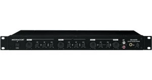 4-kanałowy mikser mikrofonowo/liniowy Miksowanie nigdy nie było takie proste! Łatwa obsługa i czytelny układ funkcji. Możliwość miksowania dwóch kanałów liniowych stereo oraz dwóch kanałów mikrofonowych mono. Każdy kanał posiada regulator barwy oraz możliwość wstępnego ustalenia poziomu sygnału głównego, za pomocą wpustowych potencjometrów. Przy pomocy dodatkowego zdalnego przełącznika można wyciszyć wyjścia główne stereo.