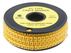 Znaczniki kablowe ślizgowe RS EC-2. Te elementy ślizgowe na żółtym znaczniku na przewodzie PVC są wykonane z najcieńszego miękkiego, Durable PCW, odpornego na erozję oleju, smaru i innych materiałów. Znaczniki kablowe typu EC-2 mają wysokiej jakości elastyczne wnętrze, dzięki czemu można je podłączyć w zakresie od 3,7 do 7,4 mm. Te slajdy na znacznikach kabla PVC mają pogrubioną czarną barwę na żółtej części ciała. Wykonane z najdrobniejszego PVC Odporne na działanie oleju i smaru Temperatura maksymalna 85°C. Dostarczane w postaci rolki