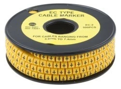 Znaczniki kablowe ślizgowe RS EC-2. Te elementy ślizgowe na żółtym znaczniku na przewodzie PVC są wykonane z najcieńszego miękkiego, Durable PCW, odpornego na erozję oleju, smaru i innych materiałów. Znaczniki kablowe typu EC-2 mają wysokiej jakości elastyczne wnętrze, dzięki czemu można je podłączyć w zakresie od 3,7 do 7,4 mm. Te slajdy na znacznikach kabla PVC mają pogrubioną czarną barwę na żółtej części ciała. Wykonane z najdrobniejszego PVC Odporne na działanie oleju i smaru Temperatura maksymalna 85°C. Dostarczane w postaci rolki