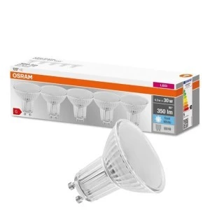 Zestaw zawiera: 5x Żarówka LED marki OSRAM z serii Base o gwincie GU10 i mocy 4,3W.