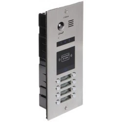 8 abonentowa stacja bramowa z wbudowanym czytnikiem zbliżeniowym umożliwiającym otwieranie wejścia za pomocą karty lub breloka.
