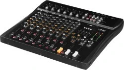 8-kanałowy mikser audio z wbudowanym odtwarzaczem MP3 oraz odbiornikiem Bluetooth. · Wbudowany interfejs USB audio (wykrywany jako zewnętrzna karta dźwiękowa) · Port USB full-duplex (równoczesne nagrywanie i odtwarzanie) · 6 kanałów wejściowych mono, z regulacją wzmocnienia, 3-punktowym korektorem i regulatorem panoramy · 1 kanał wejściowy stereo, z 3-punktowym korektorem i regulatorem balansu · Odtwarzacz MP3 z interfejsem USB oraz odbiornikiem Bluetooth · Regulowany efekt delay DSP · Regulowane wyjście FX send oraz Aux return · Podłączenie nagrywania/odtwarzania · 5-punktowy korektor graficzny stereo · Zasilanie phantom +48V, wyłączane · Odsłuch PFL (pre-fader) dla kanałów wejściowych stereo przez regulowane wyjście słuchawkowe · Diodowy wskaźnik poziomu stereo Kanały wejściowe 8 Ilość wejść mix/mono 6 Ilość wejść stereo 1 Wejście mikrofonowe 2.2 mV, sym. 8 x XLR Wejście liniowe 50 mV (stereo), 1 x 6.3 mm L/R 30 mV (mono), 8 x 6.3 mm Tape (odtwarzanie) 290 mV, 1 x RCA L/R Wejście aux 420 mV, 1 x 6.3 mm L/R Wyjście master 880 mV, sym. 1 x XLR L/R 880 mV, 1 x 6.3 mm L/R Wysyłka efektu 9 V, 1 x 6.3 mm Tape 400 mV, 1 x RCA L/R Słuchawki ≥ 8 Ω, 1 x 6.3 mm USB tak Bluetooth tak Pasmo przenoszenia 20-20 000 Hz THD 82 dB(A) Korektor basy ±15 dB/80 Hz Korektor średnie ±15 dB/2.5 kHz Korektor wysokie ±15 dB/12 kHz Korektor graficzny 5-punktowy equalizer Zasilanie phantom +48 V Zasilanie ˜ 230 V/50 Hz/25 VA Napięcie zasilające ~ 230 V Zasilanie sieciowe 50 Hz Pobór mocy w trybie pracy 25 VA Dopuszcz. temp. otoczenia 0-40 °C Wymiary 382 x 53 x 340 mm Szerokość 382 mm Wysokość 53 mm Głębokość 340 mm Waga 3.4 kg Wymiary opakowania (S x W x D) 0.43 x 0.41 x 0.09 m Waga brutto 3.89 kg Waga netto 3.42 kg