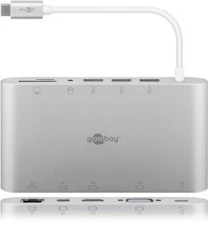 Wieloportowy adapter USB-C™ wykonany z aluminium rozszerza urządzenie USB-C™ o ethernet, gniazdo jack 3,5 mm, czytnik kart SD i Micro-SD, HDMI™, VGA, Mini DisplayPort i 3 złącza USB A 3.0.