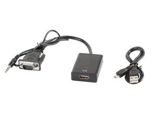 Adapter VGA/Jack 3.5 mm - HDMI marki LANBERG to pasywny konwerter sygnału z VGA i Jack 3.5 mm na HDMI, który obsługuje rozdzielczość do 1920 x 1200. Akcesorium pozwala na przetworzenie sygnału analogowego na sygnał cyfrowy i przesłanie go do urządzeń korzystających ze złącza HDMI.