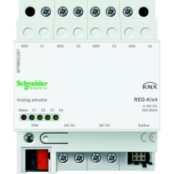 Aktor analogowy REG-K poczwórny, jasnoszary. rodzina produktów: KNX - typ produktu: moduł analogowego elementu wykonawczego - typ magistrali: KNX. Zalety: System KNX Schneider Electric proponuje jedno kompleksowe rozwiązanie osadzone w międzynarodowych standardach i produkowane przez wielu producentów, oferujące maksymalną elastyczność, komfort, bezpieczeństwo i efektywność instalacji elektrycznej zwłaszcza w przypadku nowych budynków. Idea KNX jest tak prosta, że aż genialna. KNX łączy wszystkie główne funkcje dotyczące zarządzania instalacją elektryczną w budynku, a mianowicie oświetlenie, ogrzewanie, klimatyzacja które to są połączone w inteligentny system, który pomaga obniżyć koszty operacyjne wynikające w znacznej oszczędności energii. System KNX zwiększa elastyczności instalacji i jej dostosowanie do przyszłych, zmieniających się w czasie funkcji budynku.... Zastosowanie: Rozwiązania KNX Schneider Electric są adresowane do budynków komercyjnych, jak również wysokiej klasy rezydencji:, Budynki biurowe, Budynki użyteczności publicznej, Hotele, Szkoły, Szpitale, Sklepy i centra handlowe, Rezydencje i apartamenty -. Zarządzanie funkcjami budynku dzięki KNX jest jednym z najbardziej efektywnych wariantów zmniejszenia konsumpcji energii i poprawy efektywności jej zużycia. Szczególnie w przypadku kompleksów biurowych, KNX uwidacznia swój potencjał....