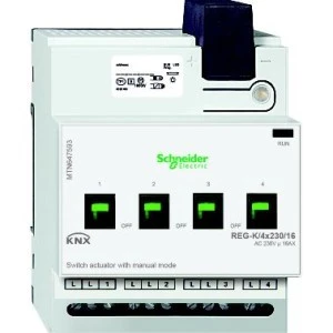 Aktor załączający REG-K/4x230/16 z uruchamianiem ręcznym, jasnoszary. rodzina produktów: KNX - typ produktu: łącznik elemtru wykonawczego - tryb pracy: MANUAL - typ magistrali: KNX - informacje dodatkowe urzadzenia modułowego: możliwość podłączenia różnych faz. Zalety: System KNX Schneider Electric proponuje jedno kompleksowe rozwiązanie osadzone w międzynarodowych standardach i produkowane przez wielu producentów, oferujące maksymalną elastyczność, komfort, bezpieczeństwo i efektywność instalacji elektrycznej zwłaszcza w przypadku nowych budynków. Idea KNX jest tak prosta, że aż genialna. KNX łączy wszystkie główne funkcje dotyczące zarządzania instalacją elektryczną w budynku, a mianowicie oświetlenie, ogrzewanie, klimatyzacja które to są połączone w inteligentny system, który pomaga obniżyć koszty operacyjne wynikające w znacznej oszczędności energii. System KNX zwiększa elastyczności instalacji i jej dostosowanie do przyszłych, zmieniających się w czasie funkcji budynku.... Zastosowanie: Rozwiązania KNX Schneider Electric są adresowane do budynków komercyjnych, jak również wysokiej klasy rezydencji:, Budynki biurowe, Budynki użyteczności publicznej, Hotele, Szkoły, Szpitale, Sklepy i centra handlowe, Rezydencje i apartamenty -. Zarządzanie funkcjami budynku dzięki KNX jest jednym z najbardziej efektywnych wariantów zmniejszenia konsumpcji energii i poprawy efektywności jej zużycia. Szczególnie w przypadku kompleksów biurowych, KNX uwidacznia swój potencjał....