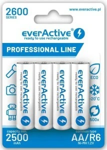 Idealne dla wymagających lamp błyskowych, latarek, reflektorów, aparatów cyfrowych, czy odtwarzaczy CD/MP3. Pojemność akumulatorów everActive jest zbliżona do baterii alkalicznych, ale można je wielokrotnie ładować (nawet do 500x). Ponadto akumulatory dużo lepiej znoszą rozładowanie dużym prądem.