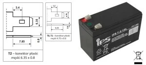 Napięcie: 12V; Pojemność: 7.2Ah; Max. prąd ładowania: 1.8A; Waga: 2.1kg; Konektor: Fast-on 187; Wymiary: 151 x65 x94 x 100mm (dł. x szer. x wys. x wys. cał.).