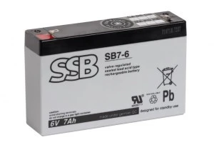 SSB model SB 7-6 – Szczelny, bezobsługowy akumulator wyprodukowany w technologii AGM. Akumulator zaprojektowany do zasilania kas i drukarek fiskalnych zasilania awaryjnego automatyki i zabezpieczeń oraz urządzeń medycznych. Projektowana żywotność akumulatora SB 7-6 dla pracy buforowej wynosi 6-9 lat w temperaturze 20-25°C.