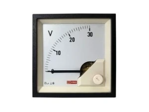 Woltomierz analogowy RS Pro DCWoltomierz analogowy RS Pro 72mm x 72mm z wycięciem prądu stałego ma zakres pomiarowy od 0 V do 30 V. Miernik panela typu DIN 72 składa się z ruchów COIL poruszających się magnesem stałym i wskazuje średnią wartość. Ruchoma COIL ruchoma składa się z magnesu, COIL zawieszonej na sworzniach, sprężyny włosowej i mechanizmu klejącego. Skale są liniowe i kalibrowane do zera. Prąd o wysokim natężeniu mierzy się za pomocą osobnych zworów zamocowanych z tyłu miernika. Miernik znajduje się w wyprofilowanej obudowie poliwęglanowej.Charakterystyka i zalety• zakres temperatur pracy wynosi od -10°C do 65°C. • Temperatura przechowywania mieści się w zakresie od -25°C do 75°C. • dokładność: 1% • wskaźnik: Ostrze noża • odchylenie wskaźnika: Od 0° do 90° • nominalny zakres napięcia woltomierza prądu stałego: Od 15 mV do 600 V. • odporność na wstrząsy: 15 g przez 11 milisekund • formowana kwadratowa obudowa przeznaczona do montażu paneli sterowania/rozdzielnic w konsolach maszynowych • Przeciążenie: 1.2-krotne napięcie nominalne (ciągłe) • wilgotność względna: Poniżej 75% średniej rocznej (bez kondensacji)Certyfikaty• certyfikat UL 94 V-0 • 2014/30/WE (dyrektywa EMC) • 2014/35/EC (dyrektywa niskonapięciowa) • certyfikat CE • Klasa IP52 • EN 61010 • VDE 0100-410: 2018-10 zatwierdzone • IEC 529 • IEC 61010 • ISO 20653: 2006-08