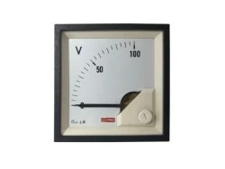 Woltomierz analogowy RS Pro DCWoltomierz analogowy RS Pro 72mm x 72mm do paneli analogowych DC posiada zakres pomiarowy od 0 V do 100 V. Miernik panela typu DIN 72 składa się z ruchów COIL poruszających się magnesem stałym i wskazuje średnią wartość. Ruchoma COIL ruchoma składa się z magnesu, COIL zawieszonej na sworzniach, sprężyny włosowej i mechanizmu klejącego. Skale są liniowe i kalibrowane do zera. Prąd o wysokim natężeniu mierzy się za pomocą osobnych zworów zamocowanych z tyłu miernika. Miernik znajduje się w wyprofilowanej obudowie poliwęglanowej.Charakterystyka i zalety• zakres temperatur pracy wynosi od -10°C do 65°C. • dokładność: 1% • wskaźnik: Ostrze noża • odchylenie wskaźnika: Od 0° do 90° • nominalny zakres napięcia woltomierza prądu stałego: Od 15 mV do 600 V. • odporność na wstrząsy: 15 g przez 11 milisekund • formowana kwadratowa obudowa przeznaczona do montażu paneli sterowania/rozdzielnic w konsolach maszynowych • Przeciążenie: 1.2-krotne napięcie nominalne (ciągłe) • wilgotność względna: Poniżej 75% średniej rocznej (bez kondensacji)Certyfikaty• certyfikat UL 94 V-0 • 2014/30/WE (dyrektywa EMC) • 2014/35/EC (dyrektywa niskonapięciowa) • certyfikat CE • Klasa IP52 • EN 61010 • VDE 0100-410: 2018-10 zatwierdzone • IEC 529 • IEC 61010 • ISO 20653: 2006-08