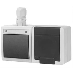 Zestaw składający się z pojedynczego poziomego gniazda natynkowego AQUANT™ 2K IP65 oraz łącznika schodowego IP65 zapewnia niezawodne zasilanie w wymagających warunkach, dzięki hermetycznej konstrukcji odpornej na wodę, pył oraz promieniowanie UV.