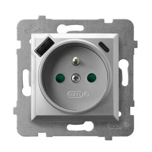 ARIA Gniazdo pojedyncze z uziemieniem z przesłonami torów prądowych, z ładowarką USB A+C srebro GP‑1UZPUSBAC/m/18