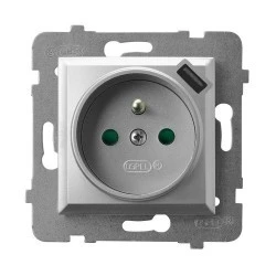 Karo Gniazdo pojedyncze z uziemieniem z przesłonami torów prądowych, z ładowarką USB srebrny perłowy GP-1SZPUSB/m/43