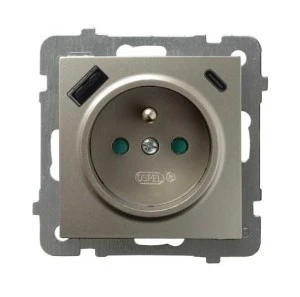 AS Gniazdo pojedyncze z uziemieniem z przesłonami torów prądowych, z ładowarką USB A+C satyna light GP‑1GZPUSBAC/m/45