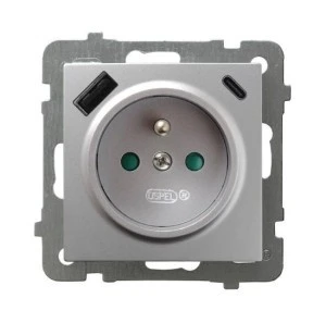 AS Gniazdo pojedyncze z uziemieniem z przesłonami torów prądowych, z ładowarką USB A+C srebro GP‑1GZPUSBAC/m/18