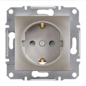Gniazdo pojedyncze SCHUKO z przesłonami w kolorze brązowym, serii Asfora, marki Schneider Electric, o numerze katalogowym EPH2900269. Długie i solidne pazury utrzymywane są za pomocą metalowych prowadnic w pozycji pionowej, co ułatwia montaż oraz zwiększa bezpieczeństwo podczas mocowania mechanizmu w puszce instalacyjnej. Zaciski w gniazdach zasilających oznaczone są w czytelny sposób oraz umieszczone są w jednej linii, dzięki czemu znacznie prostsze staje się ułożenie podłączonych kabli przed zamocowaniem gniazda w puszce instalacyjn ej (zmniejszenie efektu prężenia przewodów). Zwarta i solidna zabudowa mechanizmu minimalizuje ryzyko przypadkowego kontaktu z elementami pod napięciem i uniemożliwia wypadanie elementów nawet przy całkowitym odkręceniu śrub zacisków. Dodatkowo, solidna ramka montażowa wykonana z galwanizowanego metalu posiada nacięcia ułatwiające pozycjonowanie. Produkt może być instalowany w ramkach wielokrotnych. Asfora to pełna gama wysokiej jakości łączników i gniazd o eleganckim kształcie oraz szerokiej funkcjonalności. Dostepna jest w 6 kolorac h: biały, kremowy, aluminium, stal, brąz oraz antracyt, co pozwala stworzyć 36 kombinacji kolorystycznych. Prosta forma, szeroki asortyment oraz szybka i łatwa instalacja to zalety serii Asfora.