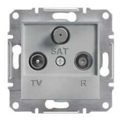 Gniazdo RTV-SAT przelotowe, tłumienie 4dB, w kolorze aluminiowym, serii Asfora, marki Schneider Electric, o numerze katalogowym EPH3500261. Podłączenie przewodów za pomocą zacisków bezgwintowych. Mechanizm gniazda antenowego posiada czytelne oznaczenie zacisków ułatwiaj ące podłączenie. Dodatkowo, solidna ramka montażowa wykonana z galwanizowanego metalu. Produkt może być instalowany w ramkach wielokrotnych. Asfora to pełna gama wysokiej jakości łączników i gniazd o eleganckim kształcie oraz szerokiej funkcjonalności. Dostepna jest w 6 kolorach: biały, kremowy, aluminium, stal, brąz oraz antracyt, co pozwala stworzyć 36 kombinacji kolorystycznych. Prosta forma, szeroki asortyment oraz szybka i łatwa instalacja to zalety serii Asfora.