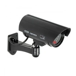 Urządzenie o realistycznym wyglądzie kamery monitorującej z migającą diodą LED, zasilaną bateriami. Urządzenie daje wrażenie ciągłego monitoringu. Atrapa przeznaczona do montażu wewnętrznego i zewnętrznego.