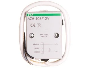 Włącznik zmierzchowy AZH‑106-12V posiada układ opóźniający załączenie i wyłączenie oświetlenia, który niweluje wpływ zakłóceń (np. wyładowań atmosferycznych) na pracę automatu.