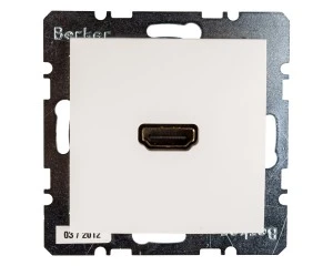 Śnieżnobiałe gniazdo HDMI wraz z mechanizmem i osłoną stanowią specjalny komplet z oferty produktowej marki HAGER POLO. W katalogu producenta jest on przypisany do nowatorskiej serii Berker B.Kwadrat.
