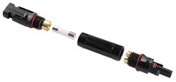 Komplet złącz MC4 (męskie + żeńskie) do łączenia modułów fotowoltaicznych z wbudowanym miejscem do zamontowania wkładki cylindrycznej topikowej 10x38 1000V DC w zakresie 2-30A