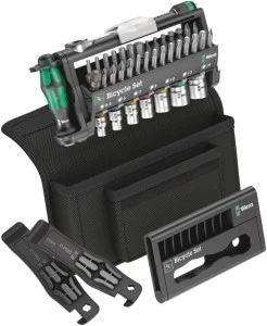 28 bitów , 1 rękojeść 813 z uchwytem do bitów 6-kątnych 1/4" DIN ISO 1173-C 6,3, a także serii Wera 1, 1 uchwyt do bitów Rapidaptor, 1 adapter 870/1 (6-kąt 1/4" na 4-kąt 1/4"), 7 kluczy nasadowych (1/4"). 1 grzechotka do bitów Wera Zyklop Mini 1, stalowa, kuta matrycowo; przeznaczona do bitów 6-kątnych 1/4" według DIN ISO 1173-C 6,3 i E 6,3 oraz serii Wera 1 i 4; dzięki adapterowi Wera 870/1 możliwe jest również zastosowanie kluczy nasadowych 1/4"; 1 dźwignia do opon 9502 z uchwytem do bitów, 1 dźwignia do opon 9503 z wykrętakiem wentyli. 1 Bit-Check, bez wyposażenia, do przechowywania mniejszej liczby narzędzi, które można zabrać ze sobą np. na wycieczkę rowerową. 1 wytrzymałe pudełko tekstylne do przejrzystego przechowywania narzędzi.