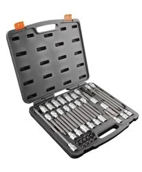 Bity Torx 1/2"" NEO (nr ref. 08-710). Zestaw składa się z 38 szt. bitów i nasadek Torx mających zastosowanie przede wszystkim przy serwisowaniu samochodów popularnych marek. W zestawie znajduje się szeroki zestaw specjalistycznych nasadek i bitówTorx, Hex, Ribe, Star oraz nasadka udarowa Spline 18mm. Wszystkie elementy wykonane są z wytrzymałej stali chromowo- wanadowej, gwarantującej wieloletnią trwałość. Całość dostarczana w praktycznym pudełku z tworzywa sztucznego. Jakość narzędzia potwierdzona certyfikatem TUV i 25-letnią gwarancją producenta. Marka NEO spełnia oczekiwania profesjonalistów.
