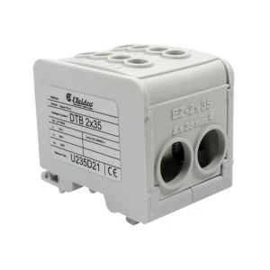 Blok dystrybucyjny DTB 2x35 w kolorze szarym. Blok posiada dwa połączenia wejściowe dla przewodów o przekroju od10 mm2 do 35 mm2 i dwa połączenia wyjściowe o przekroju od 10 mm2 do 35 mm2. Złączkę można mocować do szyny montażowej TH 35. Temperatura pracy bloku dystrybucyjnego DTB od -25 °C do +100°C. Stopień ochrony IP 20. Złączka testowana zgodnie z IEC 60998-2-1.