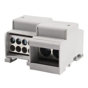 Blok dystrybucyjny DTB 2x120/8x35 w kolorze szarym. Blok posiada dwa połączenia wejściowe dla przewodów o przekroju od 35 mm2 do 120 mm2 i osiem połączeń wyjściowych o przekroju od 6 mm2 do 35 mm2. Złączkę można mocować do szyny montażowej TH 35. Temperatura pracy bloku dystrybucyjnego DTB od -25 °C do +100°C. Stopień ochrony IP 20. Testowany zgodnie z IEC 60947-7-1.