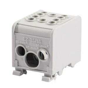 Blok dystrybucyjny DTB 35+2x16 w kolorze niebieskim. Połączenia wejściowe i wyjściowe: jedno dla przewodów o przekroju od 10 mm2 do 35 mm2 i dwa o przekroju od 6 mm2 do 16 mm2. Złączkę można mocować do szyny montażowej TH 35. Temperatura pracy bloku dystrybucyjnego DTB od -25 °C do +100°C. Stopień ochrony IP 20. Złączka testowana zgodnie z IEC 60998-2-1.