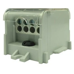 Blok dystrybucyjny DTB 70/10x16 w kolorze szarym. Blok posiada jedno połączenie wejściowe dla przewodów o przekroju od 16 mm2 do 70 mm2 i dziesięć połączeń wyjściowych o zakresie połączeń od 2,5 mm2 do 16 mm2. Złączkę można mocować do szyny montażowej TH 35. Temperatura pracy bloku dystrybucyjnego DTB od -25 °C do +100°C. Stopień ochrony IP 20. Testowany zgodnie z IEC 60947-7-1.