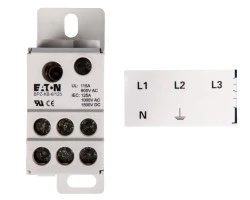 Blok listew rozdzielczych firmy EATON ELECTRIC posiada 3 podłączenia o powierzchni 10 mm2 i 4 o wymiarach mniejszych niż 6 mm2. Jego szerokość wynosi 27 mm, głębokość to 47 mm, natomiast wysokość - 66 mm. Produkt jest wyposażony w śruby, które umożliwiają montaż do zestawu na szynie DIN o płaskiej powierzchni lub na płycie montażowej. Posiada 1 biegun. Może być montowany dzięki zaciskom gwintowym lub specjalnym przystawkom na szynach zbiorczych. Pokrywa produktu może być zdejmowana. Prąd znamionowy dla tego bloku rozdzielczego wynosi 160 A.