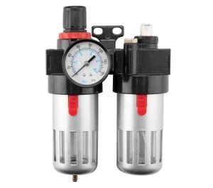 Zestaw do uzdatniania powietrza 14-734 zawiera filtr, naolejacz i reduktor ciśnienia o średnicy 1/2 cala. Wszystko zamknięte w metalowej obudowie. Charakteryzuje się: