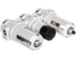 Blok trójelementowy składa się z: filtra, zaworu redukcyjnego i smarownicy. Blok przygotowania sprężonego powietrza służy do usuwania z czynnika roboczego zanieczyszczeń stałych i ciekłych, nastawiania i utrzymywania stałego ciśnienia roboczego oraz do nasycania sprężonego powietrza olejem, w celu zapewnienia poprawnej pracy elementów wykonawczych i sterujących. Gwint przyłączy w korpusach: G1/2. Dokładność oczyszczania: 10 µm. Maksymalne ciśnienie wejściowe: 1,2 MPa. Zakres ciśnień wyjściowych: 0,05-1,2 MPa. Zakres temperatur pracy: od 0 do +65°C. Sposób zasilania: przewodowy. Początek kroplenia smarownicy 3m°/h. Zalecany olej: olej hydrauliczny HL32 lub inny olej mineralny wolny od wody i od kwasów, o lepkości 2-4° E/50°.