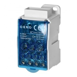 Blok rozdzielczy 500A posiada zaciski wejściowe 1x8-24mm² na szynę prądową oraz wyjściowe: 4x10mm², 5x16 mm2 i 2x25mm2 na przewody. Wymiary bloku 96x49x50mm. Bloki ORNO są przystosowane do rozbudowy, pozwalając na tworzenie bardziej złożonych układów i rozdziałów energii. Zaciskowy blok rozdzielczy posiada stopień ochrony IP20 i posiada niebieską transparentną klapkę.