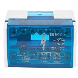 Modułowe Bloki Rozdzielcze stosuje się w obudowach niskiego napięcia w celu rozdzielenia torów prądowych. Zbudowane są z zacisków przyłączeniowych zabezpieczonych w plastikowej obudowiez pokrywą.