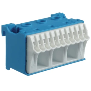 Blok samozacisków ochronny niebieski, 3x16 + 11x4 mm2, szer. 60 mm KN14N -Hager. Podłączenia główne 16 mm2 są zaciskami śrubowymi
