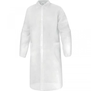 Bluza z włókniny polipropylenowa zapinania na 4 zatrzaski. Kołnierz koszulowy. Rękawy wszywane. 2 dolne kieszenie naszywane. Opakowanie jednostkowe, kolor biały rozmiar XL, zarkes rozmiarów: M DO XXL