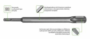 Bruzdownik SDS-plus 250mm. Hartowana część robocza pozwalająca na efektywne wykonywanie takich prac jak: podkuwanie, żłobienie i przebijanie niewielkich powierzchni materiałów budowlanych. Wysokogatunkowa stal chromowo-wanadowa zastosowana w celu zapewnienia właściwej sprężystości narzędzia. Mocowanie w uchwytach typu SDS-plus.
